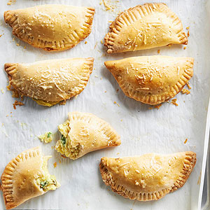 Preheat oven to 425 degrees F. Line baking sheets with parchment paper; set aside. Divide the dough into 24 pieces by rolling into a long thin log and cutting into equal portions. Shape into balls. On a lightly floured surface, roll one ball into a 4-inch circle. Prick with a fork. Brush the edge very lightly with egg wash*, then spoon a slightly rounded tablespoon of filling onto the center. Gently fold in half. Press the edges closed with a fork. Transfer to prepared baking sheet. Repeat with remaining dough and filling.