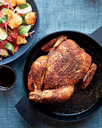 Mario Batali dresses up his smoky, spice-rubbed roast chicken with his version of a classic Italian bread salad. The optional wine grapes add a harvest feel.