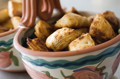 Separate the biscuits and cut each biscuit into fourths. Roll the biscuit pieces in the cheese and butter and bake for 8 to 12 minutes.