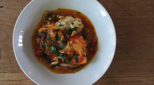 Nestle the fish in the sauce, lower the heat to medium-low so the sauce gently simmers and cooks the fish until it is opaque throughout and flakes easily, 7 to 10 minutes.