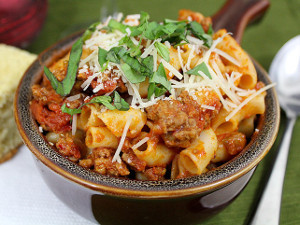 While sauce cooks, cook pasta according to package directions, reducing the cooking time by two minutes. Drain pasta, and rinse with cold water. Transfer macaroni to pot of sauce, and stir. Adjust salt and pepper, and cook everything together until flavors combine, about 10 more minutes.
