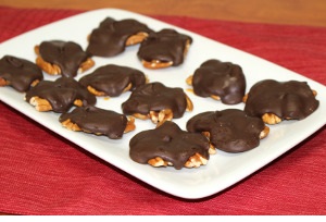 After the caramels have melted, spoon about one teaspoon of caramel over each cluster of pecans. Allow the caramel to cool and set up while you melt the chocolate.