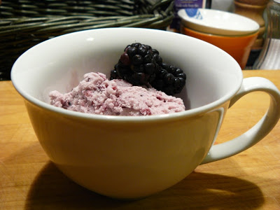 When the blackberries and cream mixtures are both chilled, whisk them together and add the vanilla. Process in an ice cream maker, and then transfer to an airtight container to harden.