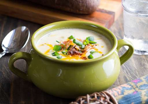 7. Ladle into bowls and top with crumbled bacon or the browned ham, cheese, sliced green onions, or chopped fresh parsley.