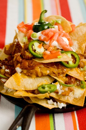 In a small saucepan on low, heat refried beans until they are loose enough to spoon onto nachos. On a large oven proof platter, spread out tortilla chips and quickly put a teaspoon of hot refried beans on each chip. Working quickly, sprinkle with onions, Jack cheese, and jalapeno slices. Spoon on chili and top that with Cheddar cheese. Repeat this layering process until ingredients are used up. Place chips in the oven at 350°F until cheese has melted. Remove from oven and place on a trivet or heatproof surface. Top nachos with sour cream, green onions, diced tomato and jalapeno slices and serve hot.