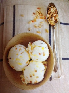 When cold, pour into ice cream maker and process. Add the olive oil as soon as the churning begins. During the last minute pf processing, add the pine nuts. Transfer to a container to freeze completely.