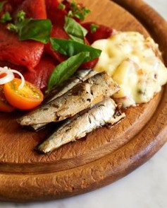 Arrange a platter with sardines, roasted peppers, cherry tomatoes, onions, and goat cheese.