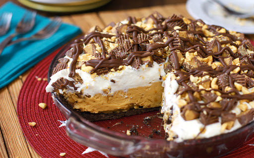 Sprinkle peanut butter cups over pie. Sprinkle chopped peanuts over pie. Use a spoon to drizzle chocolate over pie (or transfer chocolate to a plastic sandwich bag and cut a very small hole in the corner, then drizzle over pie).