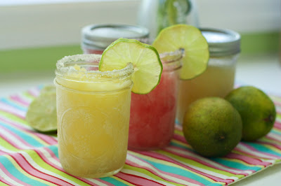 3.When you're ready to serve, remove the margaritas from the freezer. If you're using salt, dip the rim into the salt first, then use a straw or fork to stir up the margarita mixture. Add a lime slice and serve
