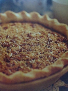 In a large bowl, combine the eggs, both sugars, and milk until well mixed. Stir in the flour, extracts, and corn syrup until well mixed. Blend in the oats, pecans, and coconut. Pour the filling into the crust. Bake 45-50 minutes until filling is golden.