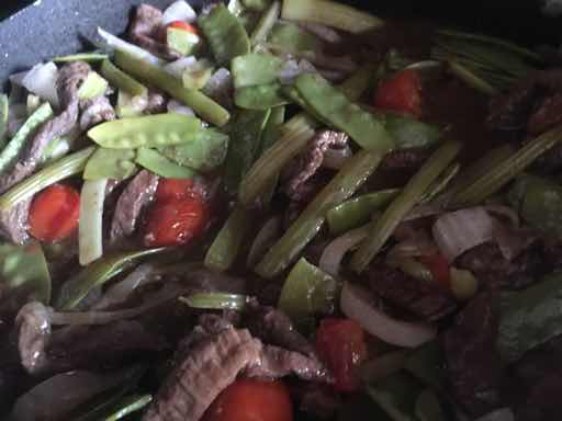 4. Start cooking rice, also slice onions thinly. Lay onion rings and celerey on top of steak, then cook, covered -medium heat 5 minutes; add pea pods, then cook 2 minutes