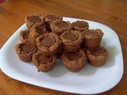 Bake in a 325F oven about 35 minutes or until set. Cool slightly and remove from pans. Melt chocolate pieces over low heat. Spoon about 1/4 tsp of melted chocolate on center of each cup.