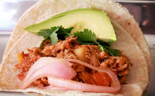 Begin by getting a large pot heated on medium heat. Add the olive oil, and brown all of the cubed pork. You want to take your time and brown each side of the pork. Do this in batches if you have to, and transfer the browned pork to your slow cooker if you have one. Once all of the pork is browned, add in the cubed potatoes and cook until almost crispy. Top with the oregano, salt, pepper, crushed tomatoes, and chipotles and adobo sauce, as worcestershire sauce. Give it a nice stir, and the place it over the browned pork cubes. Put a lid on it, cook it on low heat for 6 hours or so, and when you are ready, use a fork and tongs, and pull the pork apart. You will notice that it just falls apart. It is almost, well, it is a thing of beauty. Now you are ready to go. Get your plate ready and add two warm tortillas, overlapping them. Top with the pork tinga, add a slice of avocado, some cilantro, and the must have pickeled red onions. Fold and eat. Curious, what sound effects did you make? Trust me on this one, this is a must make, and is a perfect slow cooker recipe that feeds a lot of people, plus it is a new take on tacos. Enjoy.