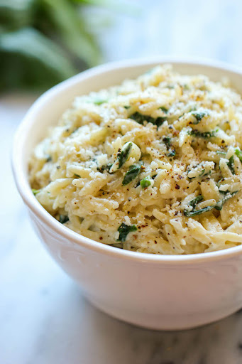 Parmesan and Spinach Orzo is a perfect side dish for pork roasts or grilled chicken -- or just about anything! The orzo is mixed with a classic white sauce, spinach and Parmesan cheese.