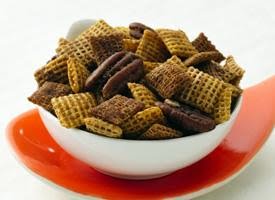 1. In small bowl, mix brown sugar and pumpkin pie spice; set aside. In small microwave-safe dish, microwave butter on High about 30 seconds or until melted. Stir in vanilla. In large microwavable bowl, mix all cereals and pecans. Pour butter mixture over cereal mixture, stirring until evenly distributed. Add sugar and spice mixture and stir until coated.