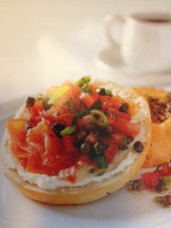 Cut the bagels in half and spread the base generously with cream cheese, then top with the salmon.