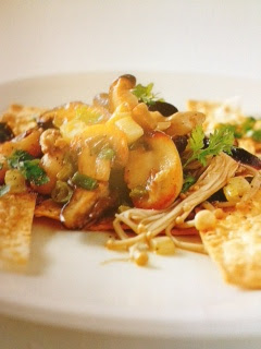 Arrange the toasted pita chips into an interlocking square. Pile the mushrooms in the center, top with chevril, and serve.