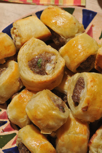 Brush the pastry rolls with a bit of the egg mixture and place on the prepared baking sheet. Bake the rolls for about 10 minutes at 400 degrees, then reduce the heat to 350 degrees and bake about 10-15 minutes more until the sausage rolls are golden brown.