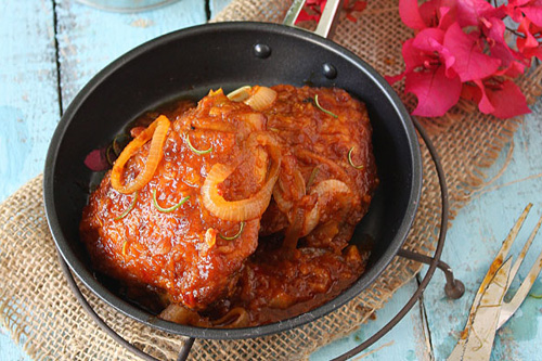 Pound or grate the garlic and ginger. Saute the paste in the 2-3 tablespoons of oil left behind in the wok or pan until fragrant. Add tomato sauce, chili paste, curry powder and honey and stir to combine. Add water to loosen up the mixture. Add salt to taste. Add the deep fried chicken pieces and stir to mix so that the chicken pieces get well coated with the sauce. Add the onion rings. Let simmer for about 5-10 minutes until the onion rings soften and the chicken pieces have absorbed some of the sauce. Add the lime juice. You may add a little more water if it gets a little dry.