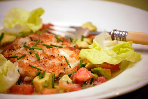 While the crab cakes are cooking, peel and pit the avocado and coarsely chop it. Combine the avocado and tomato in a bowl. Add the vinegar, oil, pepper, salt, and water, tossing gently to mix.