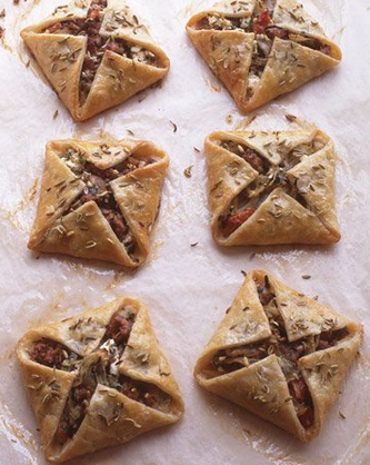 Place 1/2 cup filling in the center of each square. Fold up all four corners around the filling, so that the points meet in the center but do not touch (leave about 1/4 inch of space between them). Repeat with remaining piece of dough and filling. Transfer to prepared baking sheets.