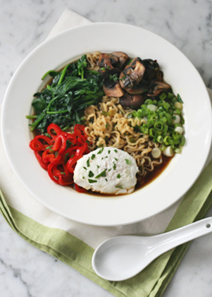 5. To serve, ladle the soup into four bowls and garnish each portion with 2 tablespoons mushrooms, 2 tablespoons peppers, ¼ cup spinach, 3 tablespoons scallions and 1 poached egg. Serve warm.