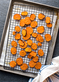 Place the sweet potato slices on the parchment. Brush them with coconut oil and sprinkle with salt. Bake 8 to 10 minutes, flip the sweet potatoes, and bake for another 5 to 10 minutes or until the edges are brown and have curled up a bit. Let the chips cool before serving.
