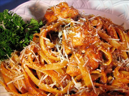 1 To Prepare Sauce:. 2 Heat butter in saucepan over medium heat. 3 Add onion and whole garlic cloves and saute for 5 minutes. 4 Remove whole garlic and stir in minced garlic, thyme, cayenne pepper, white pepper,. 5 black pepper, and basil. 6 Continue cooking until onions are dark brown but not burned, about 20 minutes. 7 Stir in chicken stock, Worcestershire, and Tabasco sauces. Simmer for 20 minutes. 8 Add tomato sauce and bring mixture to low boil. 9 Stir in sugar and green onions. Simmer for 1 hour. 10 Sauce can be made ahead of time and refrigerated until ready to use. 11 To prepare Chicken Seasoning Mix:. 12 Thoroughly combine the kosher salt, white pepper, garlic powder, cayenne pepper, black pepper, cumin, and basil. 13 To Finish:. 14 Toss seasoning mix with chicken cubes until cubes are evenly coated. In medium saucepan, melt 1/2 C butter. Saute chicken over medium heat until done, about 10 minutes. 15 Heat sauce and prepare fettuccine according to package directions. 16 Drain cooked pasta. Stir chicken into sauce and continue heating until hot. 17 Toss with cooked fettuccine. Serve immediately. Sprinkle each serving with grated parmesan cheese.
