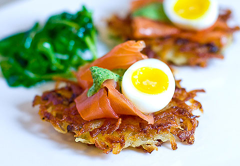 heat the remaining butter in a nonstick skillet. Crack the quail eggs using a knife, and cook over low heat fro 1-2 minutes, or until the whites have set. Serve two potato flowers on each plate, topped with asparagus, slices of gravalax, and the dressing.