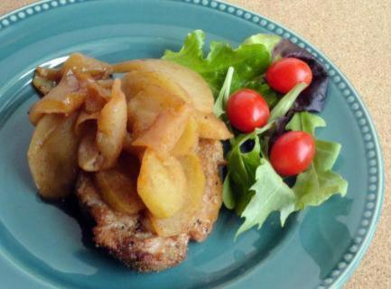 9. Remove pork chops from pan onto a serving platter and top with the apples and wine syrup.