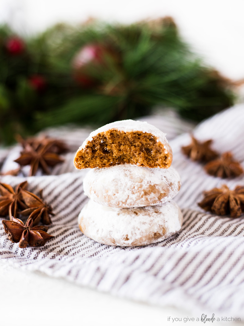 Pfeffernüsse cookies are a traditional Christmas cookie Germany. Made with molasses, anise and other seasonal spices, these cookies are chewy and coated in confectioners' sugar.