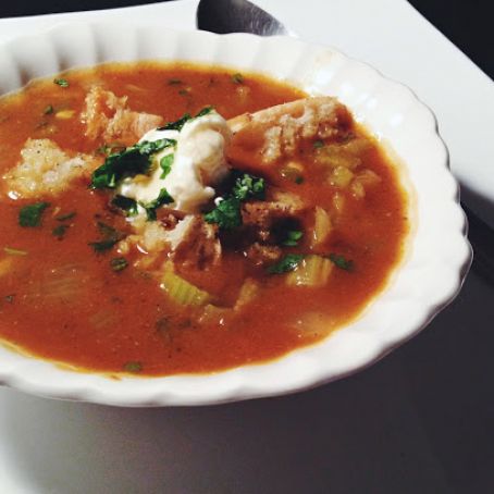 When you are ready to serve; ladle the soup into a bowl; top with the croutons, dollop of sour cream, drizzle of honey and a few cilantro leaves.