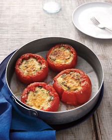 Preheat oven to 350 F. Line a 9-inch baking dish or pie plate with parchment paper. With a serrated knife, cut off the top 1/2-inch from each tomato. With a spoon or melon baller, gently remove seeds and inner membrane, being careful not to break through the flesh of the tomato. Place tomatoes in dish and season with salt and pepper.
