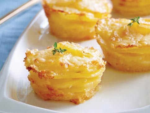 Place a layer of potato slices in the bottom of each muffin cup. Sprinkle a heaping teaspoon of cheese mixture into each cup. Repeat layers (gently pressing potatoes to pack down) until all ingredients are used up and muffin cups are filled, finishing with cheese mixture on top.
