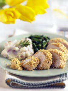 Heat oven to 350 degrees. Combine butter and garlic in a small pan and heat until melted. Let cool to room temp. Mix bread crumbs, parmesan, salt, rosemary and pepper to taste in a large bowl. Dip chicken into butter and roll in breadcrumbs. Place on baking sheet. Continue till all chicken is coated. Drizzle any remaining butter over the chicken. Bake 50-60 minutes.
