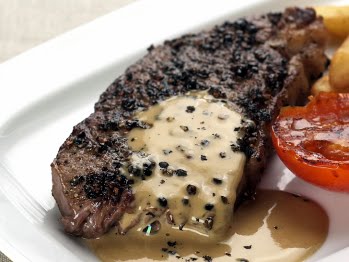 2. Crush the peppercorns in a mortar or under a saucepan and press on both sides of the steaks.