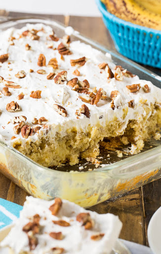 2.Using an electric mixer, beat together cake mix, banana, crushed pineapple, oil, water, eggs, and cinnamon until smooth. Stir in 1 cup pecans.