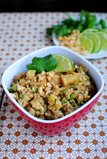 5.Add cooked quinoa, soy sauce and lime juice to the wok, and stir to combine. Cook for an additional minute or two, or until the quinoa begins to crisp up. Serve with optional chopped peanuts on top