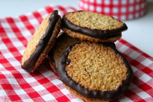 Once cookies are cool, and chocolate is melted, dip the underside of one cookie, and then place another underside onto the chocolate, adhering the two together, leave to set.