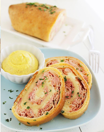 Arrange ham slices evenly over dough to within 1/2 inch of edges. Sprinkle evenly with cheese. Starting at one of the short ends, roll up dough to form log. Pinch seam together to seal. Place, seam side down, on a greased baking sheet.