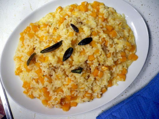In a 10-12" saute pan, heat oil over medium heat. Add onion and squash and cook until soft but not browned. Add rice and stir until toasted and opaque, 3-4 mins.
