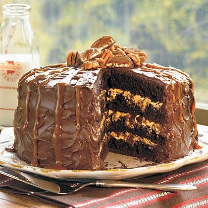 5. Using a serrated knife, slice cake layers in half horizontally to make 4 layers. Place 1 layer, cut side up, on cake plate. Spread with 1/2 cup cream cheese frosting mixture; sprinkle with one-third diced turtle candies. Repeat procedure twice. Place final cake layer on top of cake, cut side down. Spread chocolate fudge frosting on top and sides of cake. Cover and chill in refrigerator until ready to serve. Just before serving, drizzle dulce de leche ice cream topping over top of cake. Garnish with remaining halved turtle candies and pecan halves. Store in refrigerator.