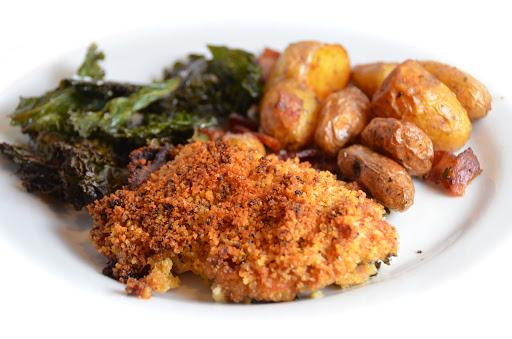 Bake the chicken for 40 minutes. Raise the heat to 400 degrees F and bake for another 10 minutes, until the crumbs are browned and the chicken is cooked through. Serve hot, warm, or at room temperature.