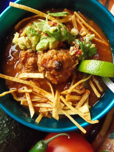 3. Add the remaining ingredients for the soup base, minus the black beans. Stir well to combine, taste for salt. Bring to a boil, reduce heat just slightly. Carefully add the albóndigas to the soup, stir gently. Cover and simmer for 35 to 40 minutes. During the last 10 minutes of cooking time, add in the remaining black beans. Cook for just another few minutes. Serve right away, garnish with fried tortilla strips, guacamole, and lime wedges. Yields up to 6 hearty servings or 8 as a starter.