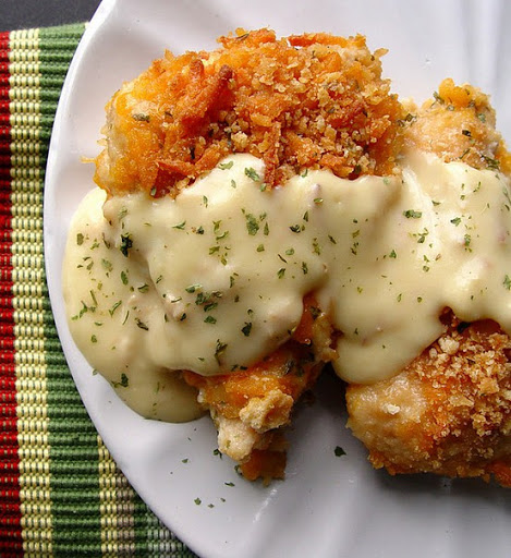 8. Into a medium sized sauce pan combine the cream of chicken soup, sour cream and butter with a whisk. Stir it over medium high heat until the sauce is nice and hot. Serve over the chicken.
