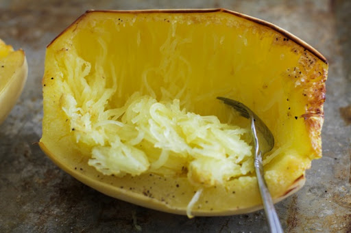 When the squash is cool enough to handle, use a fork to gently scrape the flesh, releasing spaghetti-like stands. Do this until both halves of the spaghetti squash are scraped clean and place the “spaghetti” into a large serving bowl.