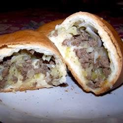 Bierocks were a staple food item at family gatherings(weddings, reunions, funerals, etc.) in the central Kansas town I was raised. Grandma's recipe for this baked Volga German sandwich has been handed down through the generations. Basically a meat/cabbage mixture filled sweet roll that makes a great main dish, or in smaller sizes, an excellent appetizer. They reheat well, so I tend to make large batches and freeze for quick n easy meals. I have seen recipes across the internet adding shredded cheeses, or heaven forbid-a frozen dough, but the old German ladies never did!!