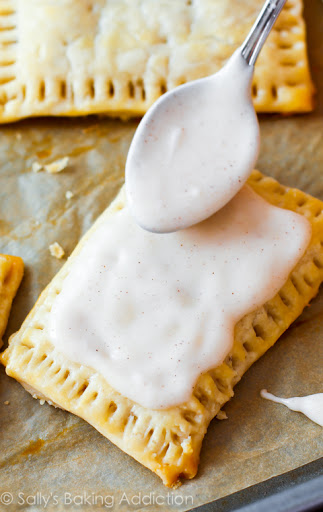 Make the glaze: whisk all of the glaze ingredients together in a medium bowl until it reaches a spreading consistency. You want a thick glaze, but not too thick that it is hard to spread. Add another teaspoon or two of milk if needed. Use a spoon or knife to glaze each pop-tart. The glaze will slightly harden in about an hour, if you prefer to wait that long.
