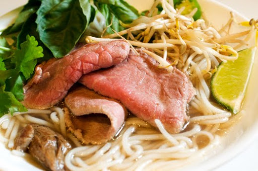 Build your garnish plate by adding the basil, cilantro, bean sprouts, and more. Now the time we have been waiting for. Getting the bowls ready. Bring a large pot of water to a boil. Add in about 1/2 pound of the banh pho noodles to the boiling water. Cook for about 2 minutes, just until tender, being careful not to overcook the noodles. Get your soup bowl ready, and get a large one. No skimping here. Add in your cooked noodles, top with thinly sliced pieces of sirloin, thinly sliced onion, and a couple of the meat cubes before ladling in your broth. Let this set for a few minutes as it will cook your meat. Next, build upon your noodles by adding hoisin and Sriracha if you desire, tasting your broth to make sure it is just right for you. Next add the basil, and other herbs. Give a good mix, and dig in.