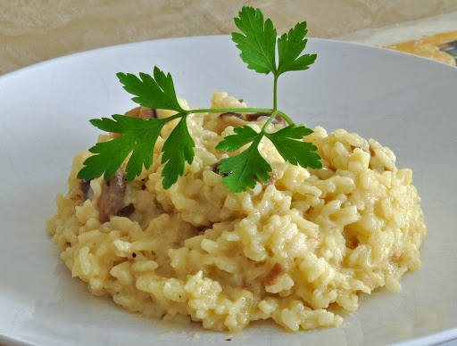 4. To serve, dollop the risotto into warm soup bowls and garnish each one with a few olive slices, curls of cheese, and a sprinkle of parsley. Take to the table immediately.